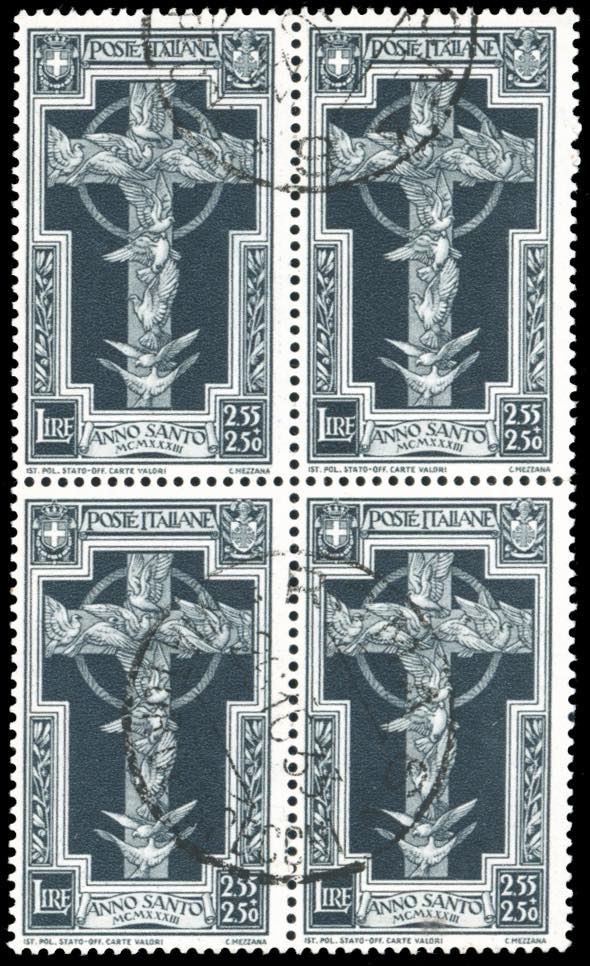 1933 - 2,55+2,50 lire Anno Santo (349), blocco di quattro, usato, perfetto. Non comune. Raybaudi e Ferrario.