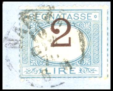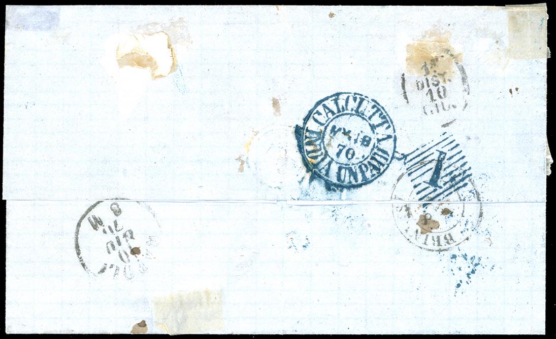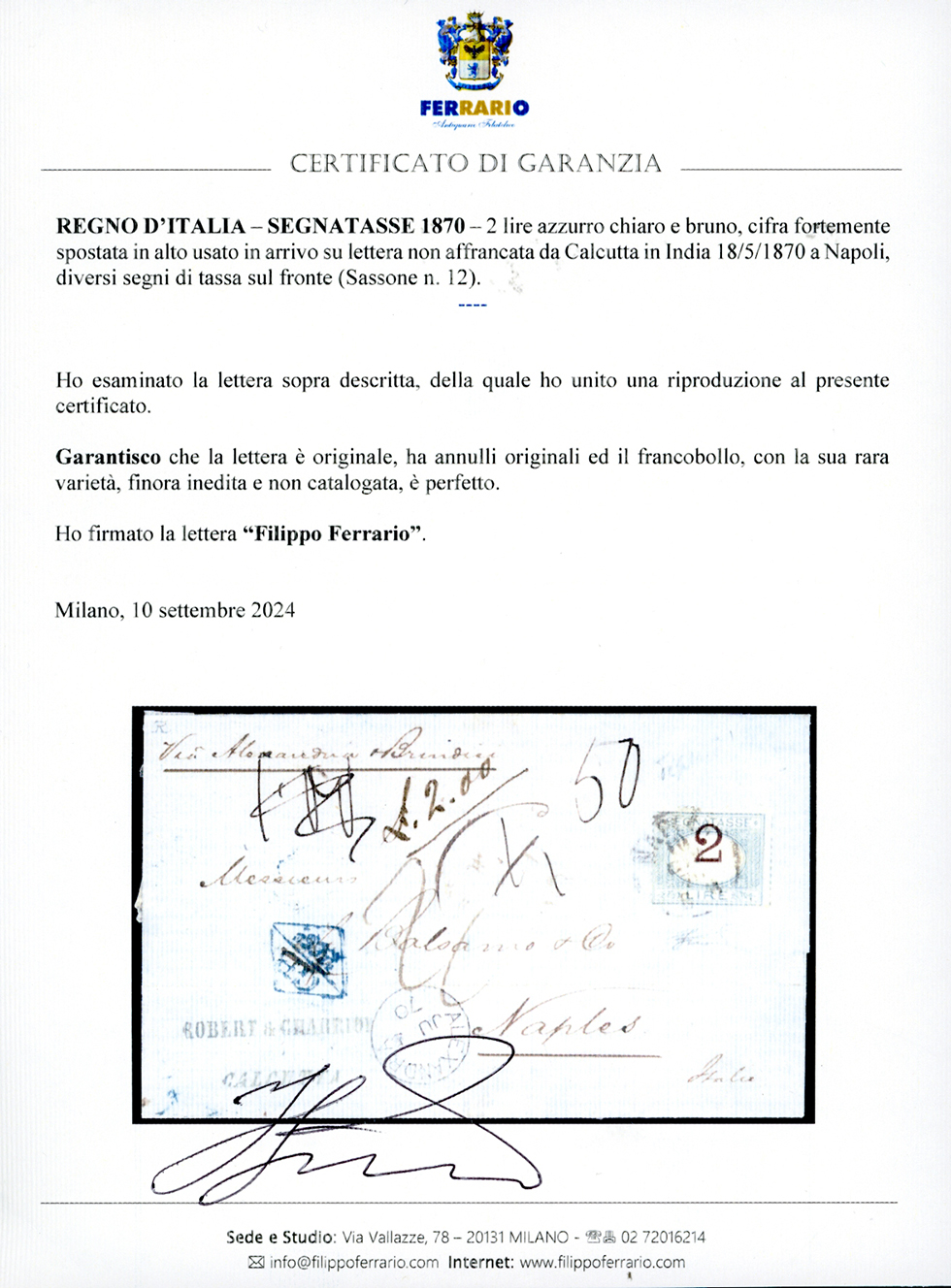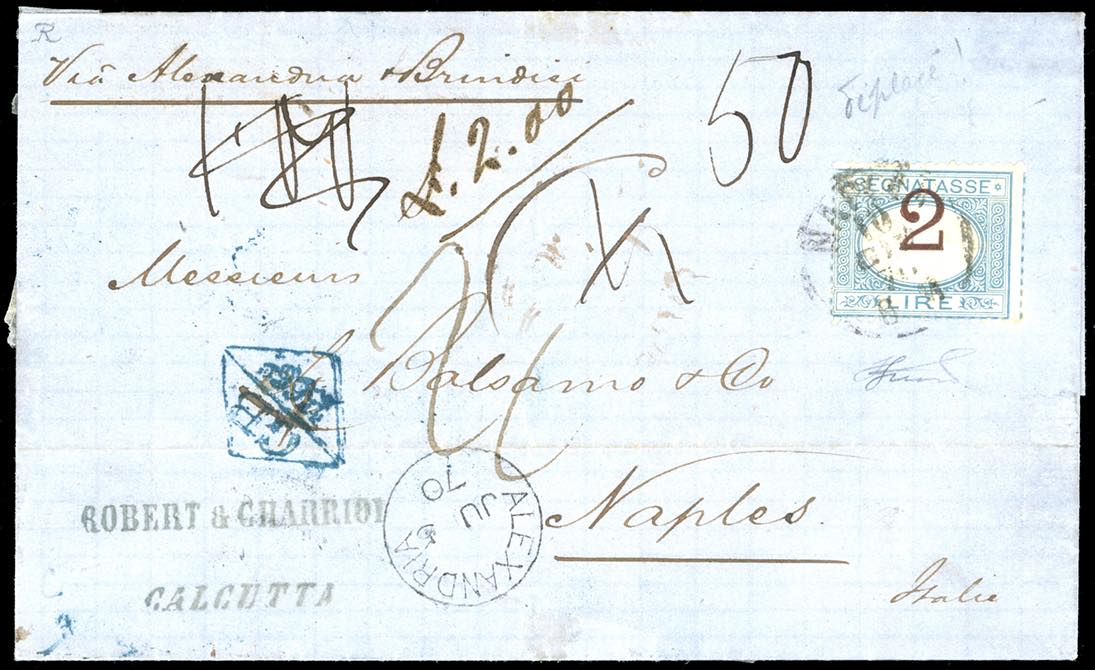 1870 - 2 lire azzurro chiaro e bruno, cifra fortemente spostata in alto (12), perfetto, isolato su lettera, con vari segni di tassa, in base ai transiti, da Calcutta in India 18/5/1870 a Napoli 10/6/1870, bolli di transito di Alessandria d'Egitto e Brindisi. Insieme estremamente raro per la varietà inedita e non catalogata del 2 lire. Cert. Ferrario.