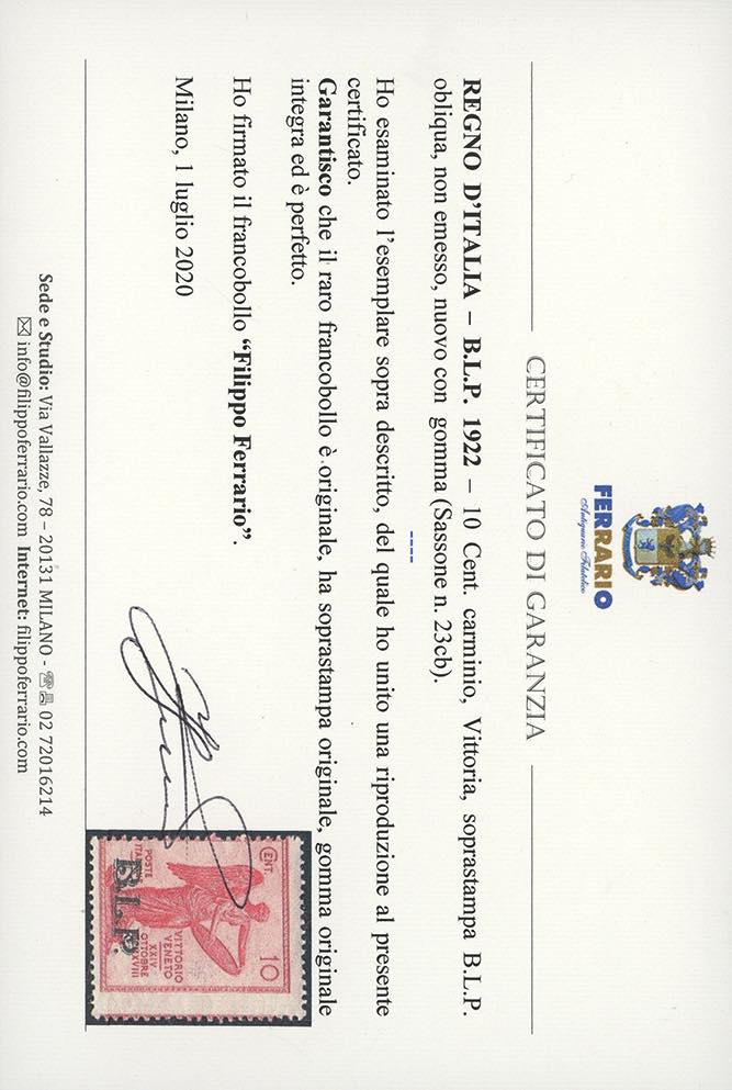 1922 - 10 cent. Vittoria, non emesso, soprastampa BLP obliqua (23cb), gomma originale integra, perfetto. Bello e raro! G.Colla, cert. ... Read more