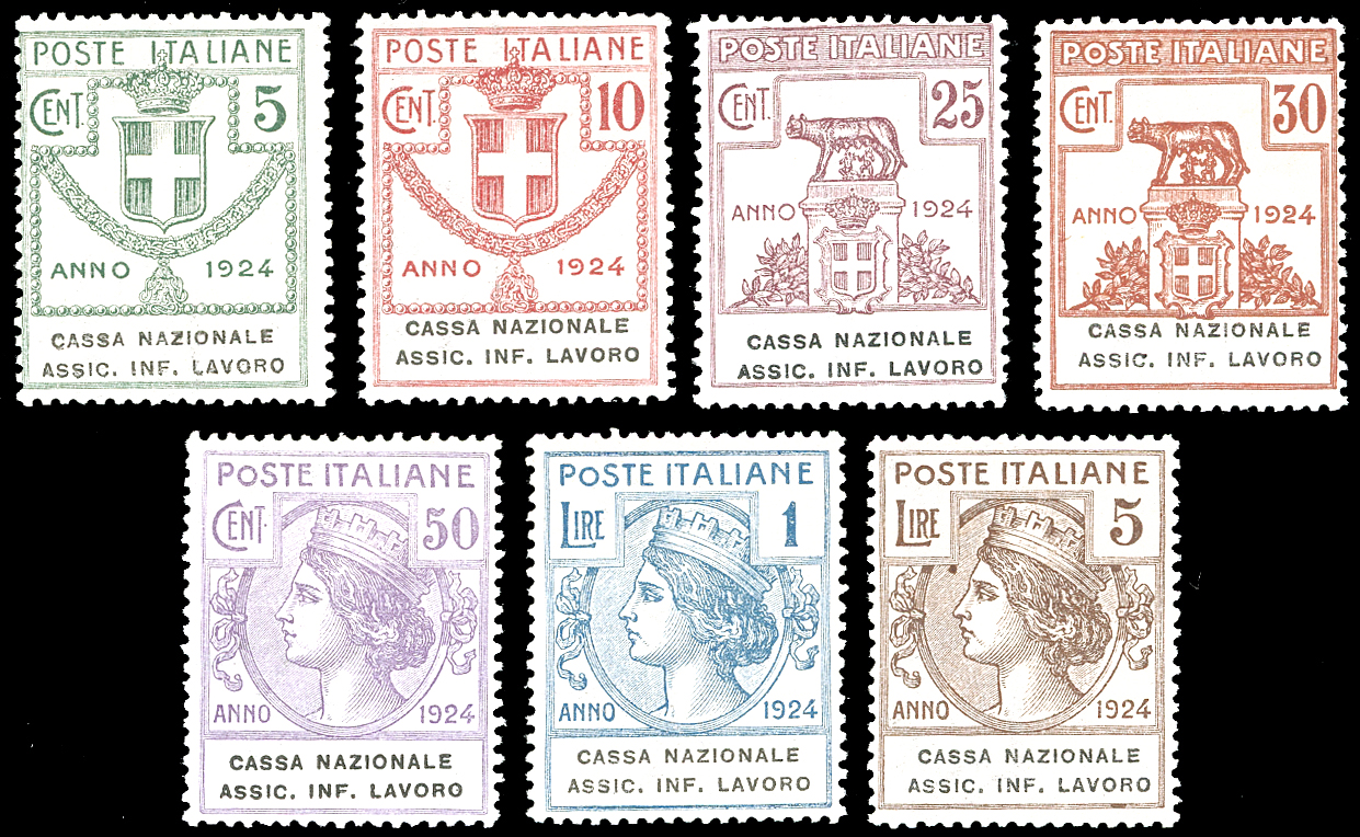 CASSA NAZIONALE ASSIC.INF.LAVORO 1924 - Serie completa (17/23), alti valori ben centrati, gomma originale, leggera traccia di linguella, perfetti e molto freschi (cat.Sassone € 340/680).
