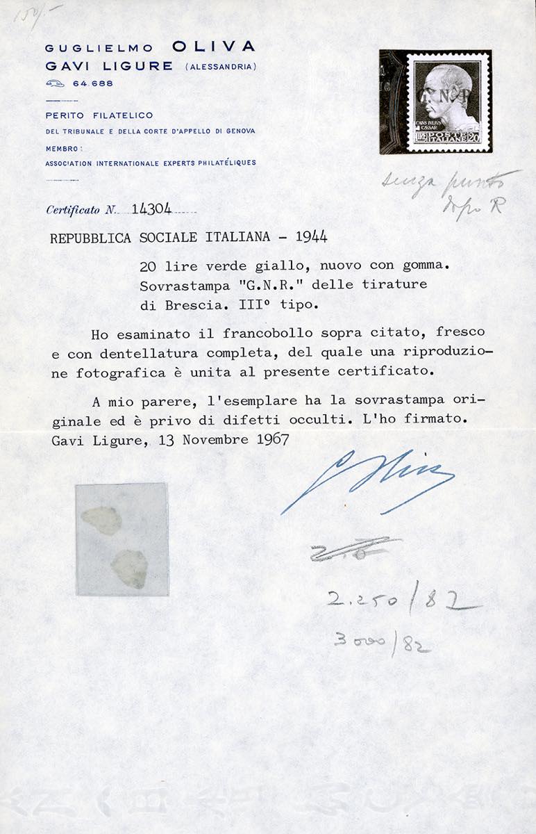 1943 - 20 lire soprastampa G.N.R. del III tipo di Brescia, posiz. 75 senza punto dopo "R" (487/IIIac), nuovo, gomma originale, linguella leggera, perfetto. Splendido ed UNICO ESEMPLARE NOTO. Grande rarità del settore. Fiecchi, cert, G.Oliva, Andreoni, Ferrario. (cat. Sassone € 30.000 per gomma integra).