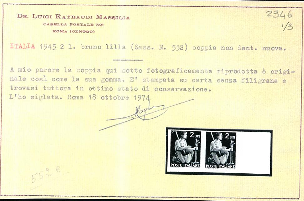1945 - 2 lire Democratica, senza filigrana e non dentellato (552d), gomma originale integra, perfetto. Estremamente raro, DUE SOLI ... Read more