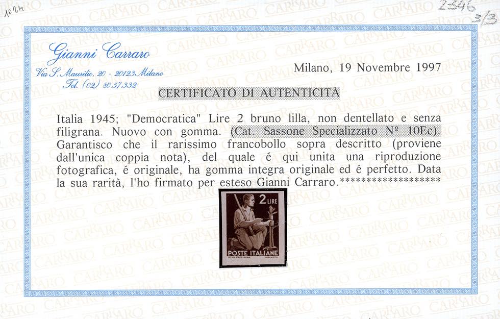 1945 - 2 lire Democratica, senza filigrana e non dentellato (552d), gomma originale integra, perfetto. Estremamente raro, DUE SOLI ESMEPLARI NOTI. Cert. Carraro, Sorani e fotocopia del cert. Raybaudi della coppia di provenienza.