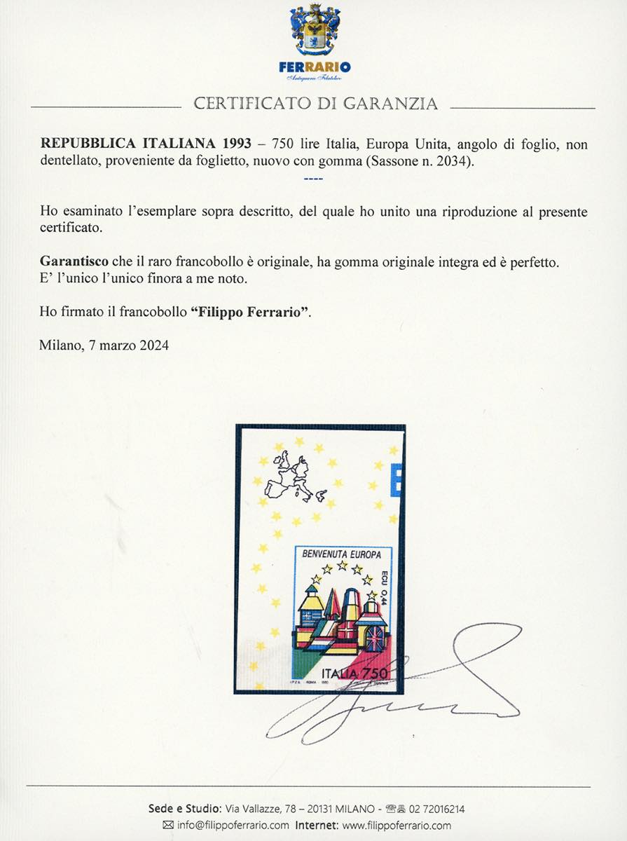 1993 - 750 lire Italia, Europa Unita, non dentellato, proveniente da foglietto (2034), nuovo, angolo di foglio, gomma originale integra, perfetto. Rarissimo, probabilmente unico e non catalogato. Cert. Ferrario.
