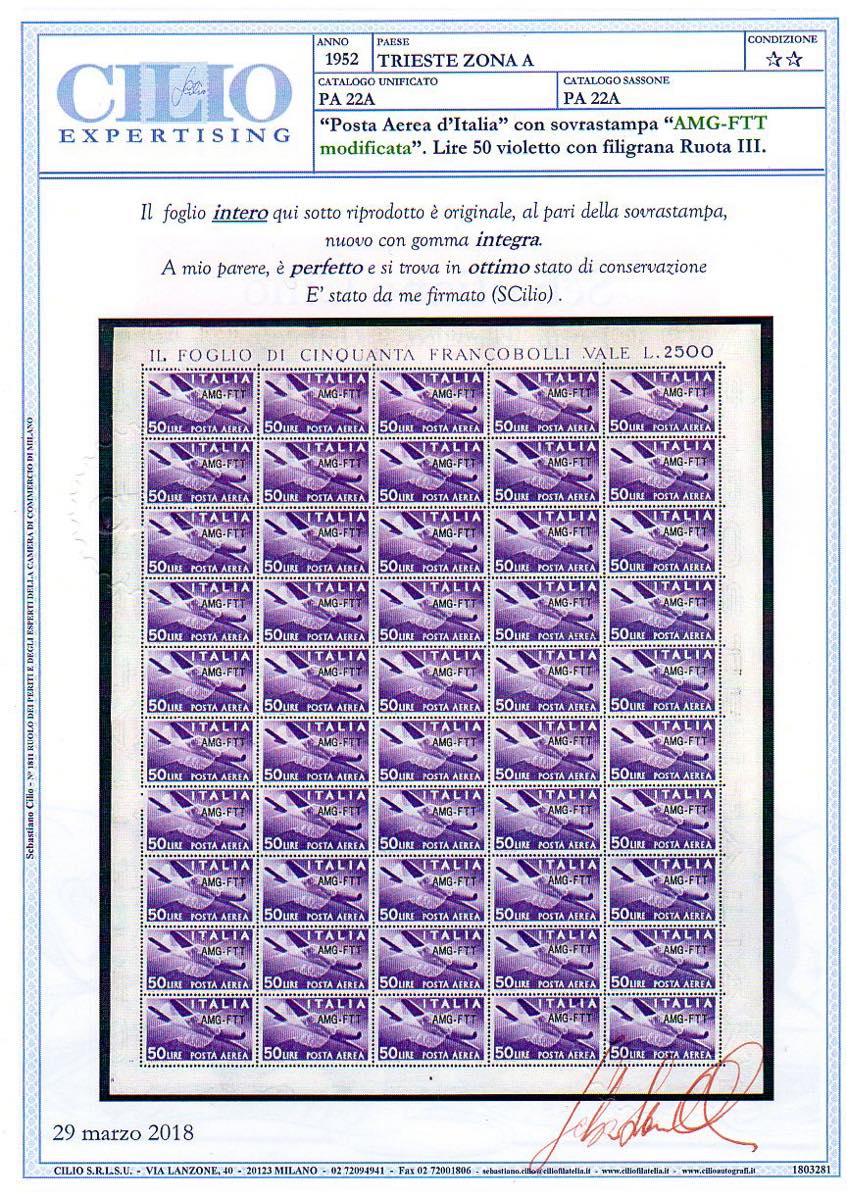 POSTA AEREA 1954 - 50 lire, nuovo tipo di soprastampa (22A), foglio completo di 50 esemplari, ottima centratura, gomma originale integra, ... Read more