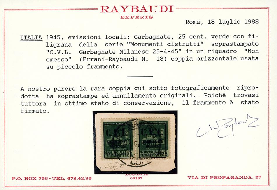 GARBAGNATE MILANESE 1945 - Monumenti Distrutti, i tre valori con filigrana corona, soprastampati, non emessi, serie completa con il primo ed il terzo esemplare in coppia su frammento (Errani Raybaudi 16/18,Orlandini 16/18), usati, annulli originali, perfetti. Rarrissimi. Ferrario, cert. Raybaudi.