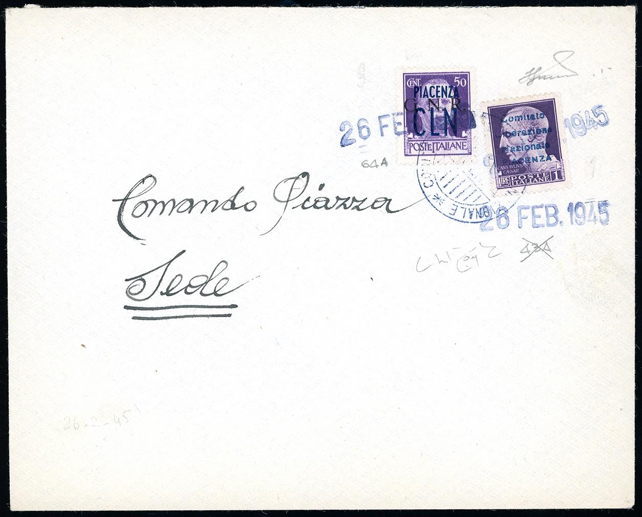 PIACENZA 1945 - 1 lira Imperiale, SOPRASTAMPA AZZURRA IN CARATTERI PIU' GRANDI "Comitato Liberazione Nazionale Piacenza" e 50 cent. GNR soprastampato (Errani Raybaudi 43, varietà inedita e non catalogata e 64), perfetti, usati su busta da Piacenza 26/2/1945 per città. Insieme straordinario, in quanto il francobollo da 1 lira con tale soprastampa risulta essere PROBABILMENTE L'UNICO FINORA NOTO. Cert. Raybaudi del 1988, che però erroneamente lo classifica come n. 43A, cert. Ferrario.