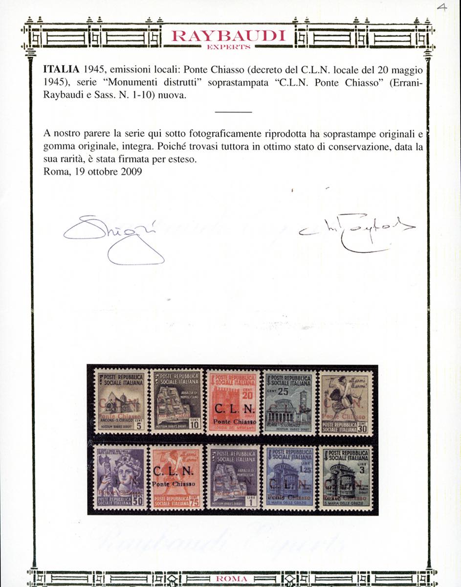 PONTE CHIASSO 1945 - Soprastampati, serie completa (1/10), gomma originale integra, perfetti. Rari, tiratura 100 serie. Cert. Oro Raybaudi.