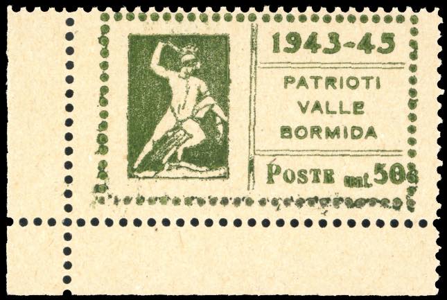 VALLE BORMIDA 1945 - 50 cent. Teseo, decalco completo al verso (17e), angolo di foglio, gomma originale integra, perfetto. Ferrario.