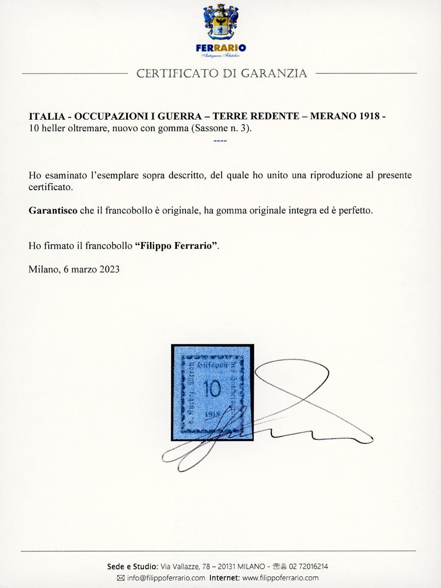 MERANO 1918 - 10 h. oltremare (3), nuovo, gomma originale integra, perfetto. Molto bello, raro. Cert. Ferrario.