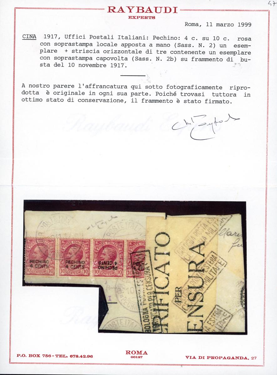 PECHINO 1917 - 4 cent. su 10 cent. Leoni, soprastampa locale a mano, striscia orizzontale di tre con un esemplare con soprastampa capovolta e singolo (2h,2), perfetti, usati su ampio frammento di busta da Pechino 10/11/1971, bolli e fascetta di censura. Insieme raro. Bargagli, Ferrario, cert. Raybaudi.