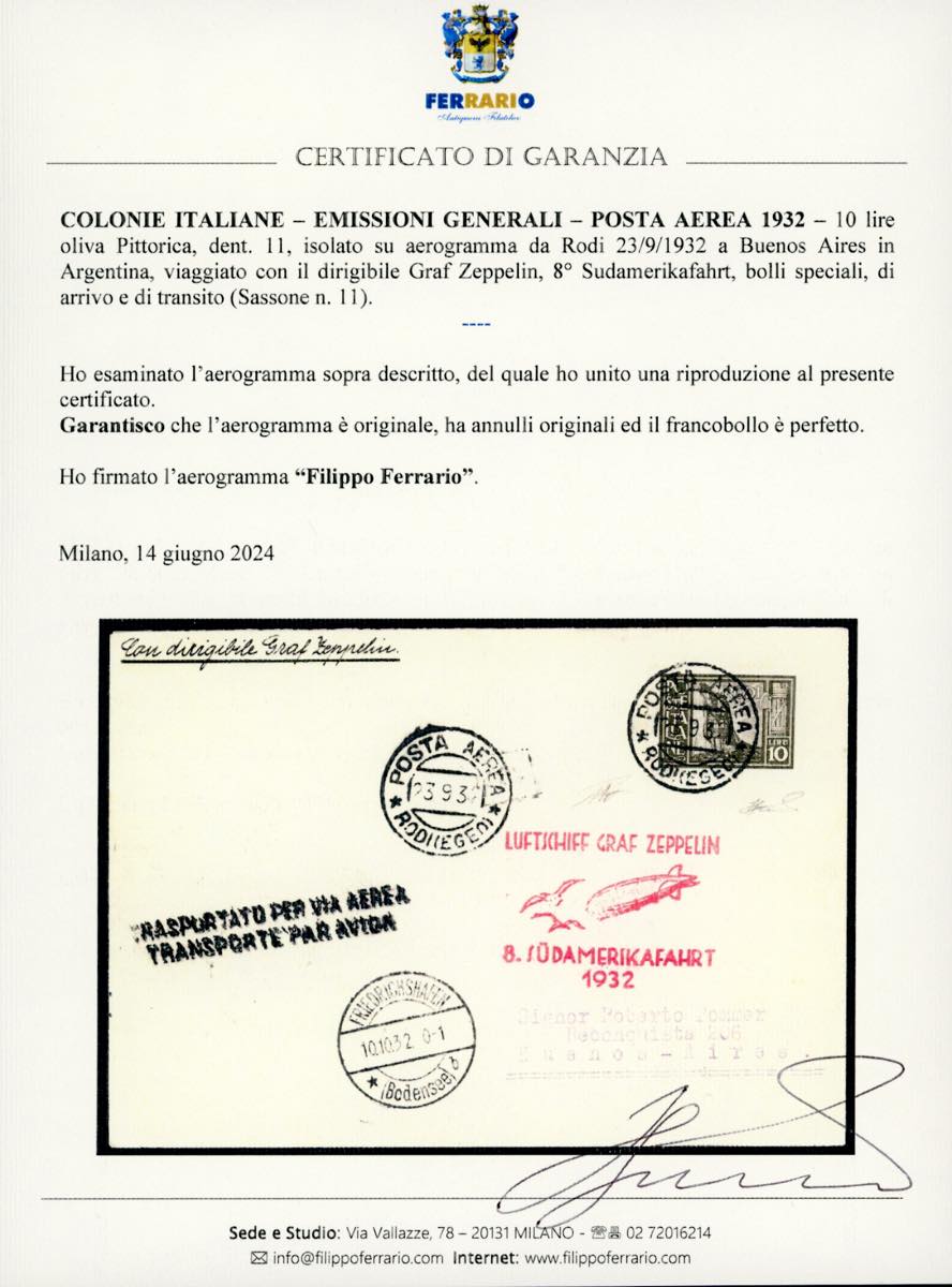 POSTA AEREA 1932 - 10 lire oliva Pittorica, dent. 11 (11), isolato e perfetto, su aerogramma da Rodi 23/9/1932 a Buenos Aires in Argentina, viaggiato con il dirigibile Graf Zeppelin, 8°Sudamerikafahrt, bolli speciali, di arrivo e di transito. Molto bello e raro. Cert. Ferrario.