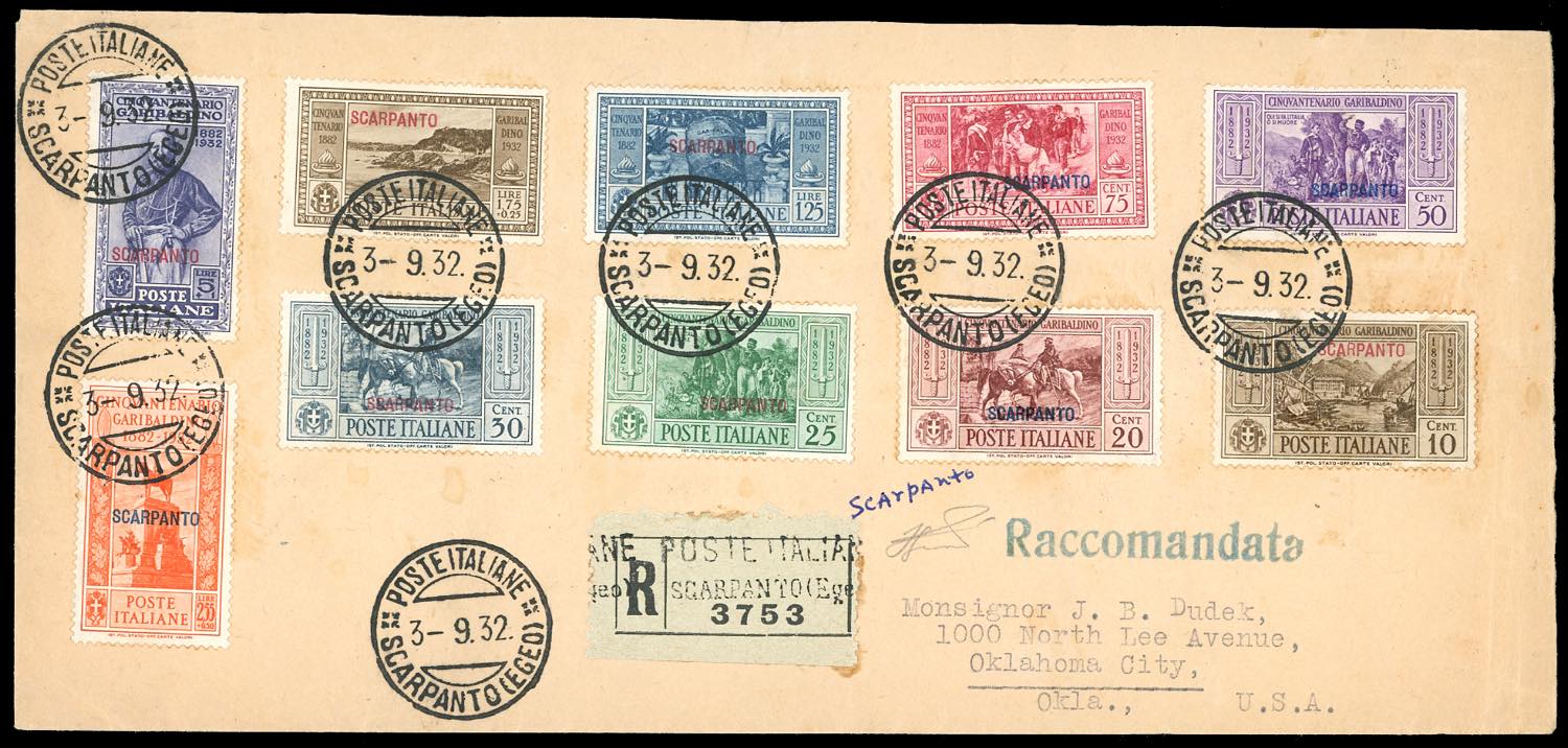 SCARPANTO 1932 - Garibaldi, serie completa (17/26), perfetti, su busta raccomandata da Scarpanto 3/9/1932 per gli Stati Uniti, bollo d'arrivo al verso. Ferrario.