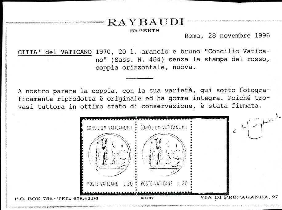 1970 - 20 lire Concilio Vaticano, senza la stampa del rosso (484), gomma originale integra, perfetto. Varietà rarissima e non catalogata. Fotocopia cert. Raybaudi della coppia di provenienza, cert. Ferrario.