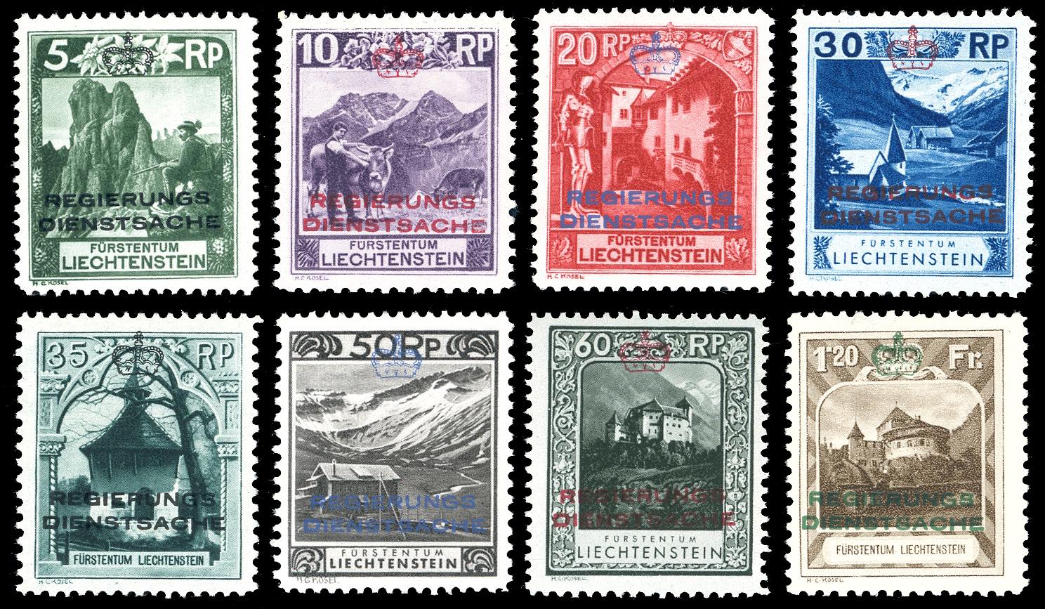 LIECHTENSTEIN SERVIZIO 1932 - Soprastampati, serie completa di 8 valori con le dentellature più comuni (1A/4A,5c,6B/7B,8A), gomma ... Read more