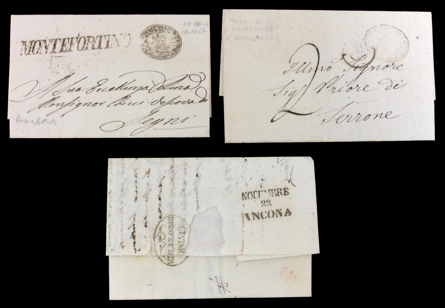 STATO PONTIFICIO SANITA' 1837/1867 - Bell'insieme di 15 lettere prefilateliche o non affrancate del periodo, tutti con bolli e/o tagli di disinfezione. Qualche ripetizione, ma notate diverse interessanti presenze.
