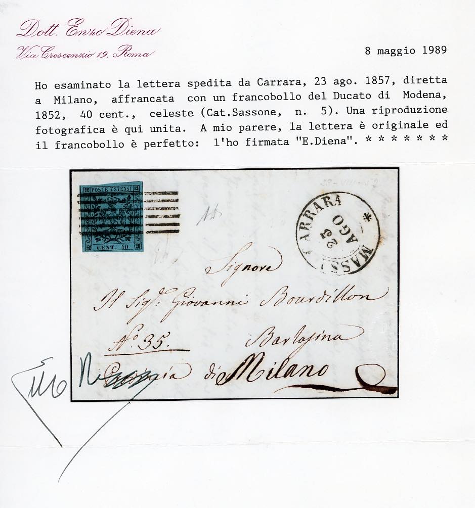 1852 - 40 cent. celeste (5), perfetto, isolato su lettera da Massa Carrara 23/8/1852 a Barlassina. Bella! Emilio ed A.Diena, cert. E.Diena.