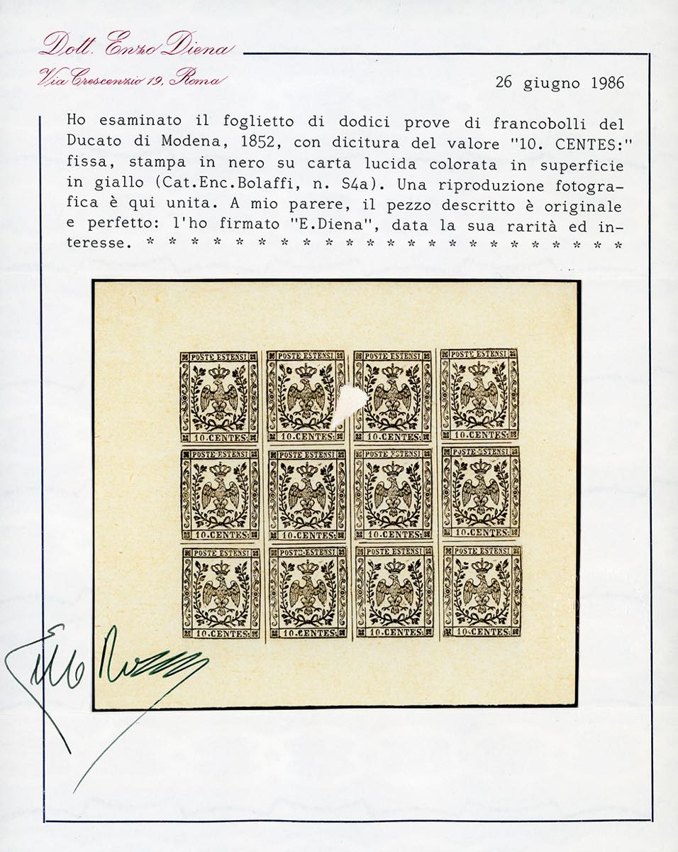 1852 - 10 cent. giallo, carta lucida colorata solo al recto, foglietto completo di 12 prove (P18), senza gomma come sempre, perfetto e di ottima qualità. Raro. A.Diena, Vaccari, cert. E.Diena.