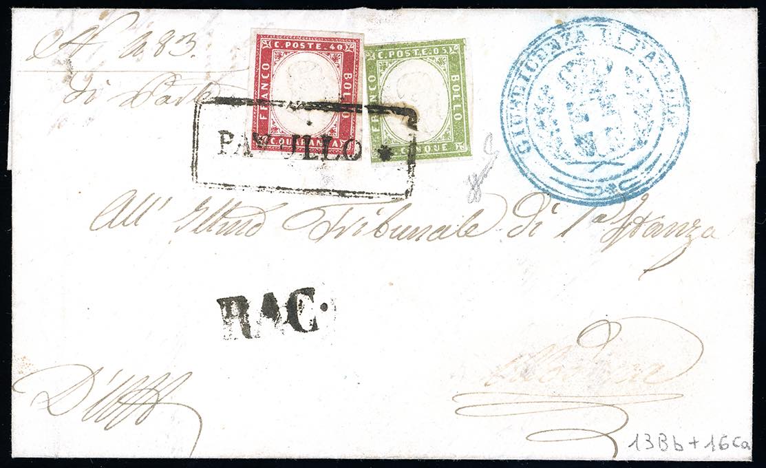 PAVULLO, cartella + RAC sul fronte punti 7 - 5 cent. verde oliva chiaro, corto a sinistra, 40 cent. carminio, perfetto e ben marginato, IV emissione di Sardegna (13Bb,16Ca), su fresca lettera raccomandata del 5/5/1860 per Modena. Ferrario.