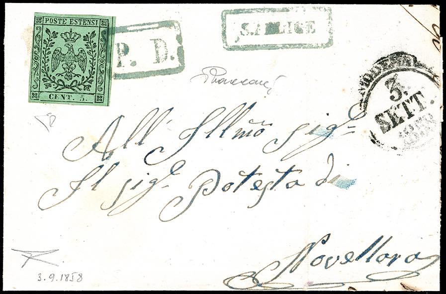 SAN FELICE, PD + cartella azzurri punti R1 - 5 cent. verde, punto dopo la cifra (7), perfetto, su lettera del 3/9/1858, transito di Modena sul fronte a Novellara. Molto rara e di ottima qualità. Vaccari, cert. E.Diena e Bottacchi.