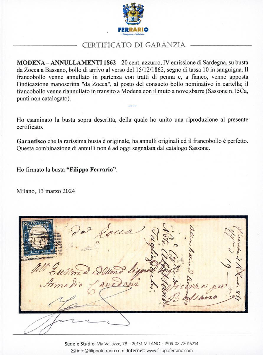 ZOCCA, a penna, non catalogato - 20 cent. IV emissione di Sardegna (15Ca), ottimo stato, su busta per Bassano 15/12/1862, tassata 10 in sanguigna. Il francobollo venne annullato in partenza con tratti a penna e riannullato in transito a Modena con il muto a 9 sbarre, mentre sul fronte venne apposta l'indicazione manoscritta "da Zocca", al posto del consueto bollo nominativo in cartella. Insieme INEDITO ED UNICO, rarità del settore. Fiecchi, cert. Ferrario.