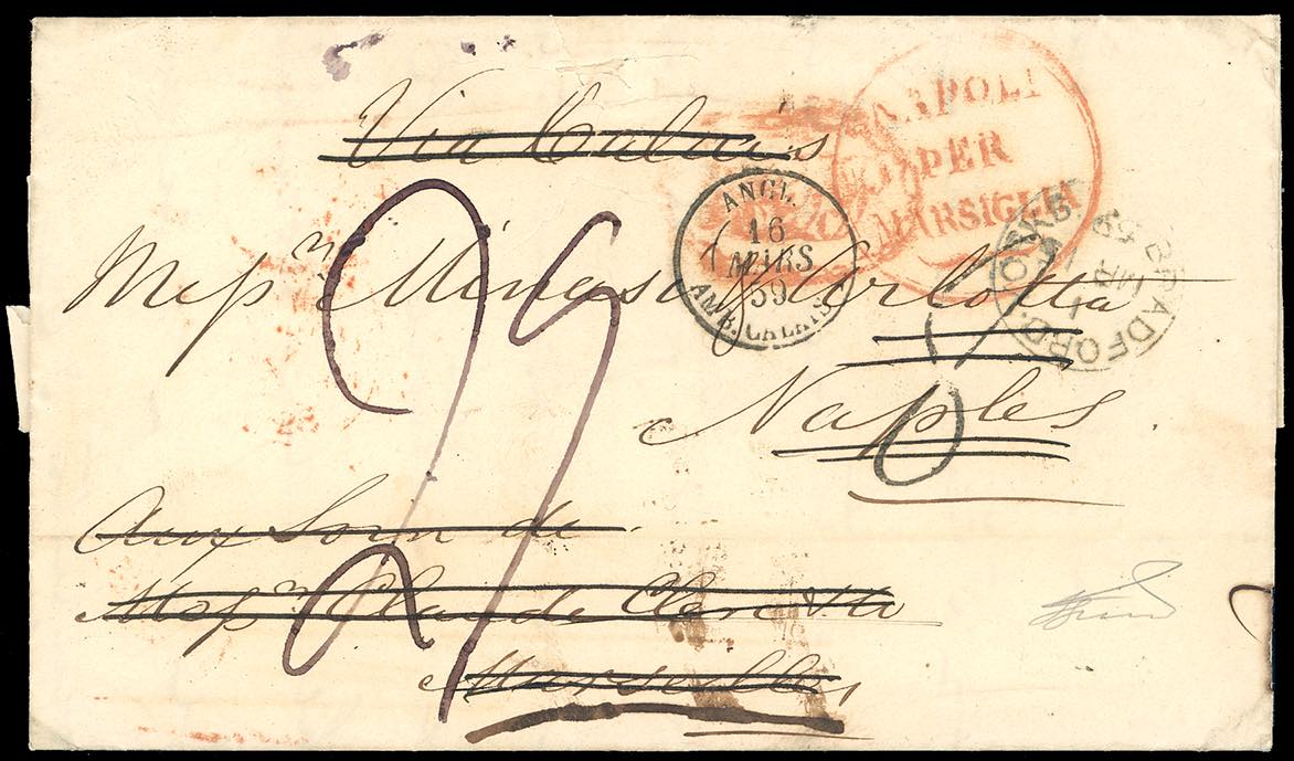 INCOMING MAIL GRAN BRETAGNA-FRANCIA 1859 - Lettera non affrancata da Bradford 15/3/1859 inizialmente indirizzata a Marsiglia e successivamente rispedita a Napoli, segni di tassa sul fronte. Interessante e non comune. Ferrario. Ex coll. Imperato.