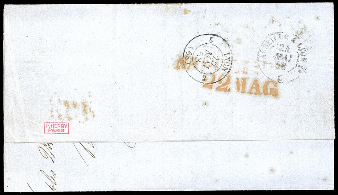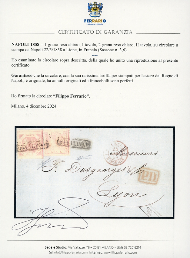 1858 - 1 grano rosa chiaro, I tavola, 2 grana rosa chiaro, II tavola (3,6), perfetti e ben marginati, su circolare a stampa da Napoli 22/5/1858 a Lione, in Francia. Rarissima tariffa per stampati per l'estero dal Regno di Napoli, di splendida qualità. Sorani, cert. Ferrario.