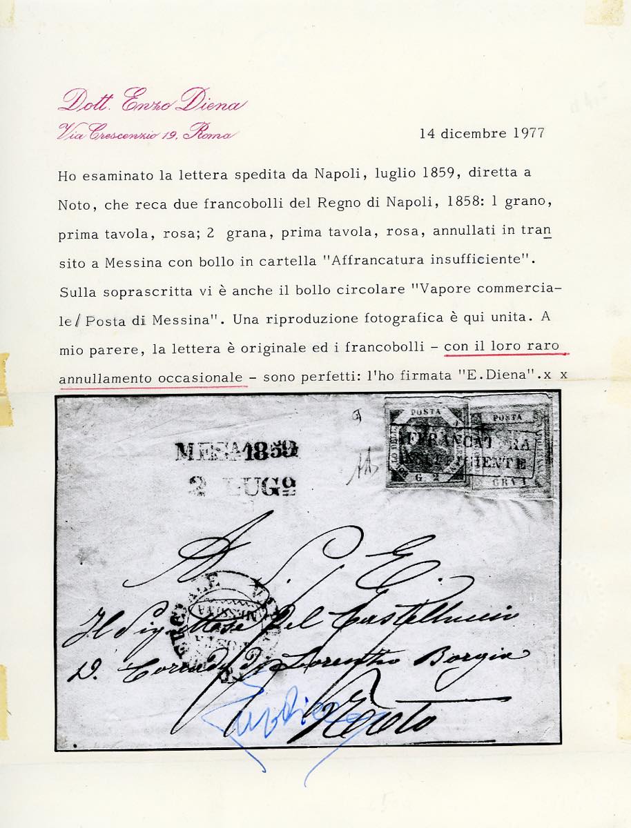 1859 - 1 grano rosa, 2 grana rosa, entrambi I tavola (3,5), perfetti, annullati in transito a Messina 2/7/1859 con il bollo in cartella "affrancatura insufficiente" punti 13, su sovracoperta di lettera da Napoli a Noto, tassata, bollo circolare "vapore commerciale/Posta di Messina" punti 11 sul fronte. Insieme estremamente raro, probabilmente unico, Ferrario, cert. E.Diena.