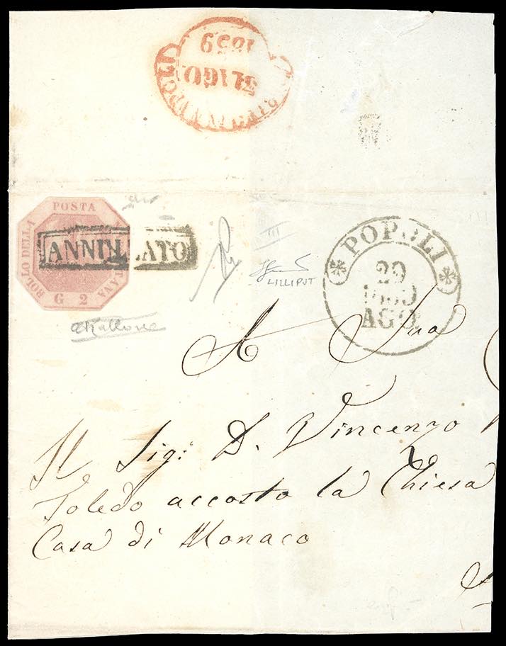 1859 - 2 grana rosa chiaro, I tavola (5), ritagliato lilliput, su gran parte di lettera da Popoli 29/8/1859 a Napoli. Raro. Rattone, ... Read more