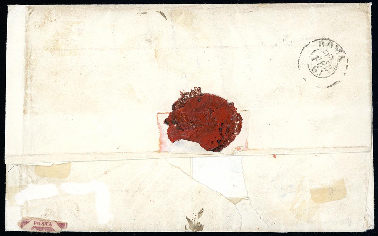 1861 - 2 grana rosa brunastro, III tavola (7), eccezionale affrancatura di 17 esemplari, in coppie o strisce, su lettera di porto multiplo da Lecce 12/2/1861, annullo a svolazzo, a Roma, tassata 24 baj. Si tratta della MASSIMA AFFRANCATURA MULTIPLA FINORA NOTA CON ANNULLO A SVOLAZZO del Regno di Napoli. Grioni, Chiavarello. Cert. Ferrario. Ex coll. Imperato.