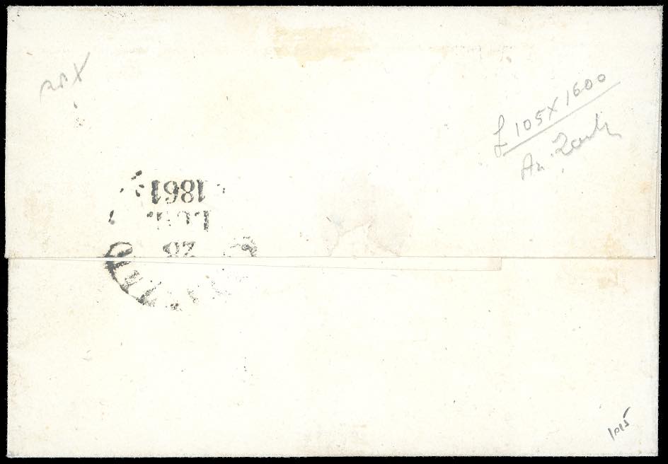 PIZZO, svolazzo + cerchio rosso punti R1 - 1 grano nero grigiastro (19), coppia verticale, perfetta e ben marginata, su fresca sovracoperta di lettera del 26/7/1861 a Catanzaro. Bella e rara. Em. e A.Diena, Bolaffi, cert. Bottacchi.