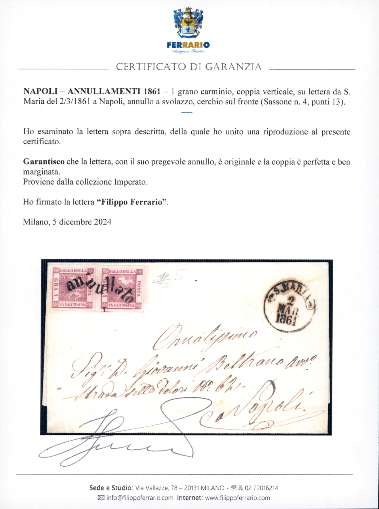 S.MARIA , svolazzo + cerchio punti 13 - 1 grano (4), coppia verticale, perfetta e ben marginata, su lettera del 2/3/1861 per Napoli. Raro annullo, ottima qualità. Cert. Ferrario. Ex coll. Imperato.