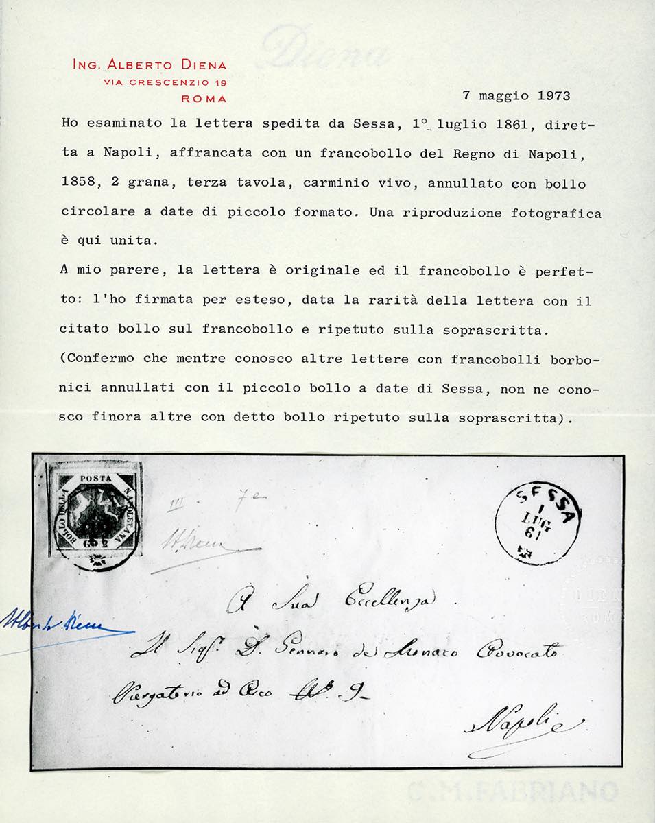 SESSA, cerchio piccolo ripetuto sulla soprascritta punti R2 - 2 grana (7e), perfetto, isolato su sovracoperta di lettera del 1/7/1861 per Napoli. Molto bella e rara con il datario ripetuto! Cert. A.Diena e Colla.