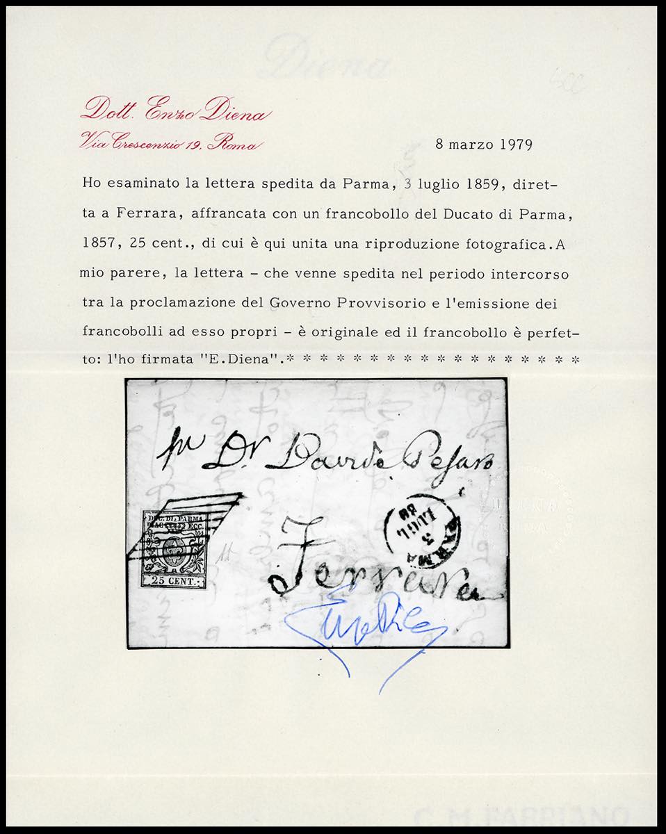 1859 - 25 cent. bruno lilla (10), perfetto, su fresca lettera da Parma 3/7/1859 a Ferrara. Pregevole lettera dal Governo Provvisorio di Parma a quello delle Romagne, di ottima qualità. A.Diena, cert. E.Diena.