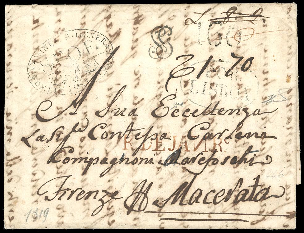 1819 - Lettera prefilatelica da Rio de Janiero, in Brasile del 18/5/1819 diretta a Macerata, sul fronte lineare rosso "R.DE JANR.O" e ovale in nero "Por Lisboa", diverse indicazioni di tassa, bollo di sanità "SG" di Genova e bollo "SEOF" di Bologna. Molto rara! Ferrario.