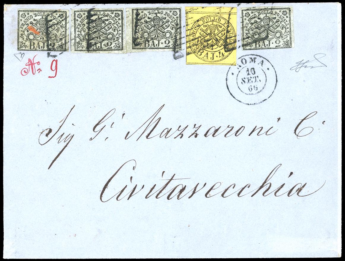 1866 - 2 baj grigio azzurrastro, quattro esemplari, margini da ottimi a rasenti, 4 baj giallo, bordo di foglio (3Ab,4A), su fresca lettera di sei porti da Roma 10/9/1866 a Civitavecchia. Affrancatura molto rara e scenografica. E.Diena, Ferrario. Ex coll. Rothschild ed Imperato.