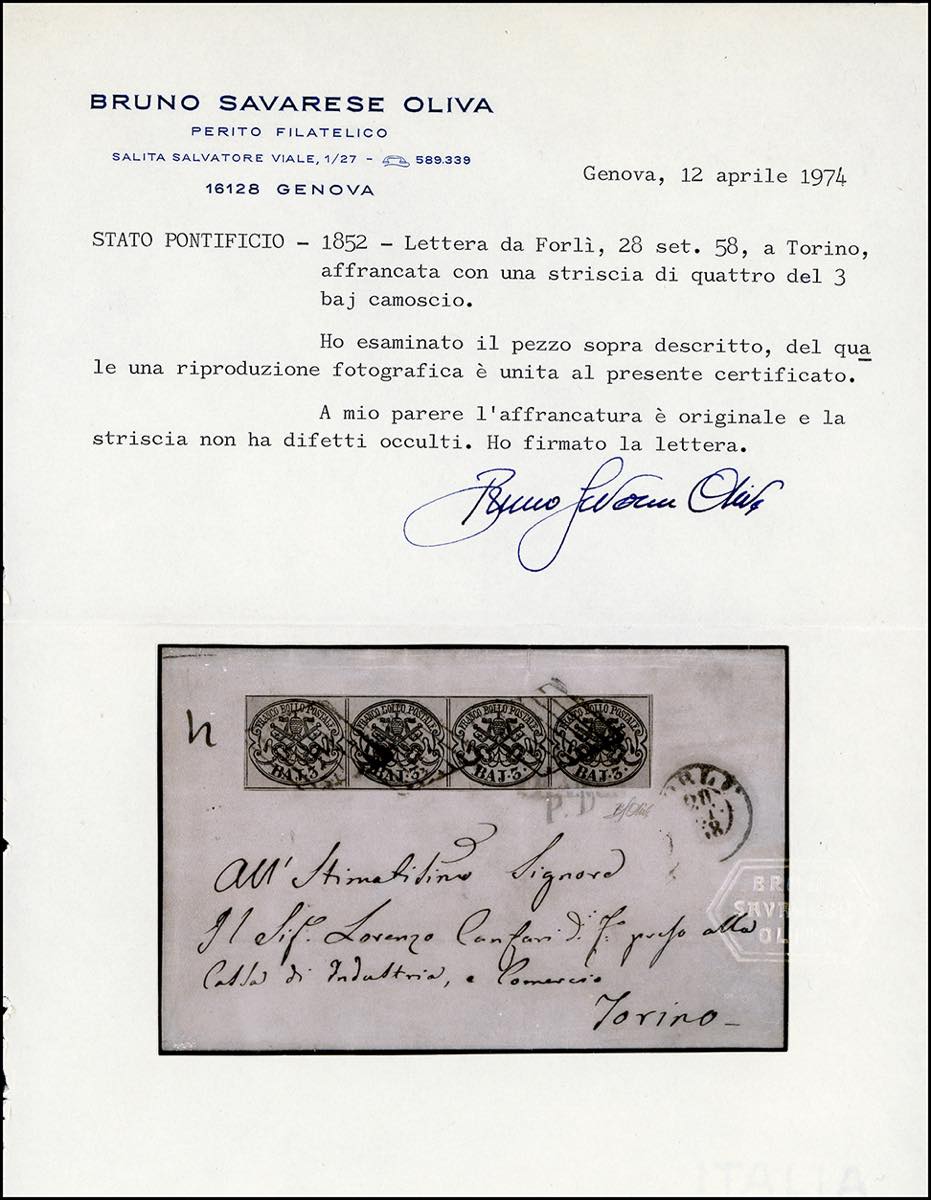 1858 - 3 baj bruno grigiastro chiaro (4a), striscia orizzontale di quattro, perfetta, su lettera da Forlì 28/9/1858 a Torino, bolli rossi "franca", parziale coannullatore, e PD. Molto bella e rara. Cert. Ferrario.