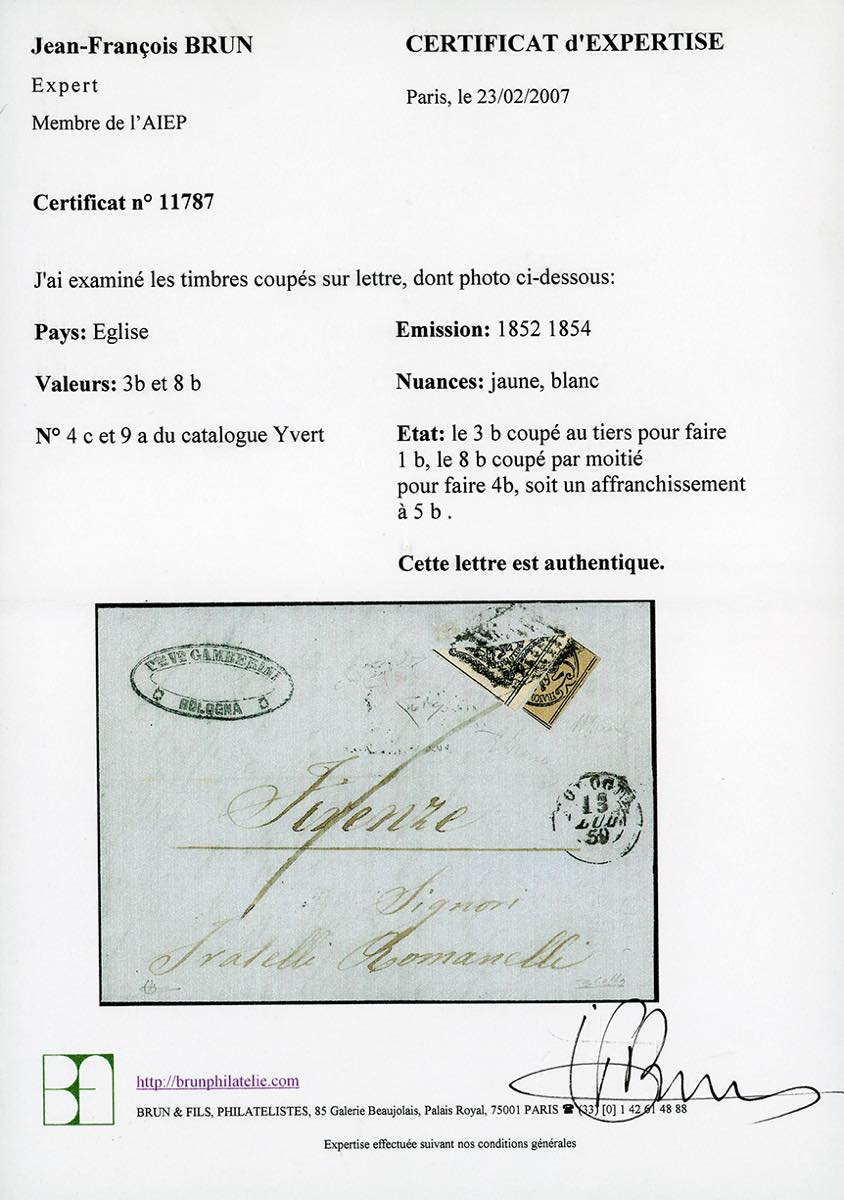 1859 - 3 baj bruno, frazionato verticalmente ad 1/3, 8 baj bianco, frazionato diagonalmente a metà (4Aa,9), perfetti e ben marginati nei lati non interessati dal taglio, su fresca lettera da Bologna 13/7/1859a Firenze. Bella e rara! Em., A. ed E.Diena, Raybaudi, Colla, cert. Brun.
