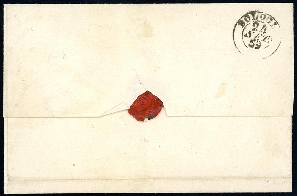1859 - 3 baj verde scuro (4), perfetto, su fresca lettera da Forlì 23/9/1859 a Porretta. Primo mese d'uso, ottima qualità. Grioni, Raybaudi, Ferrario, cert. E.Diena.
