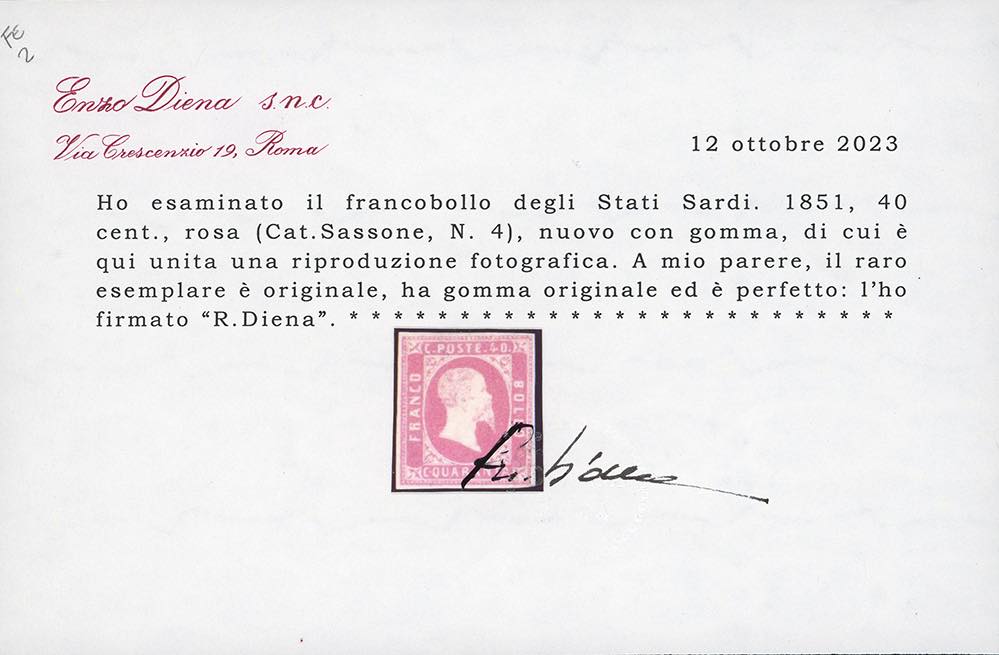 1851 - 40 cent. rosa (3), nuovo, gomma originale, lieve traccia di linguella, perfetto e molto fresco. Raro. Emilio e Alberto Diena, cert. ... Read more