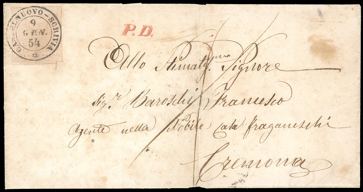 1854 - 40 cent. rosa chiaro (6), appena sfiorato a destra, su lettera da Castelnuovo Scrivia 9/1/1854 a Cremona, bollo P.D. rosso.