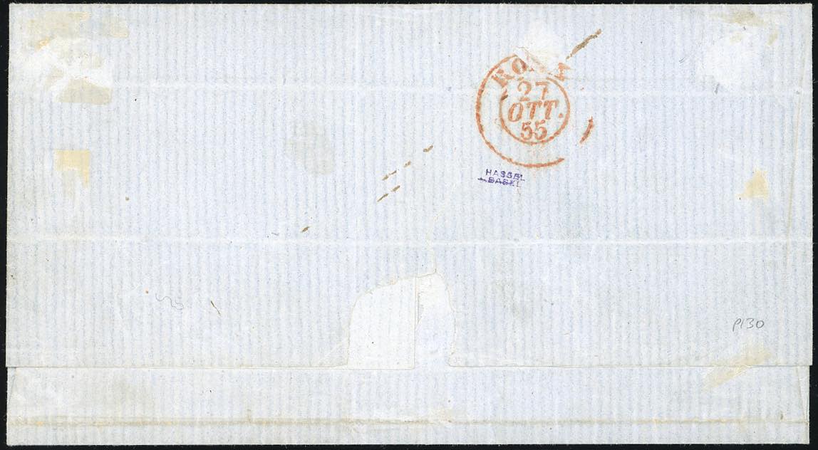 1855 - 40 cent. rosso mattone, 20 cent. azzurro (9,8), perfetti e ben marginati, su sovracoperta di lettera da Sarzana 20/10/1855 a Roma, ... Read more