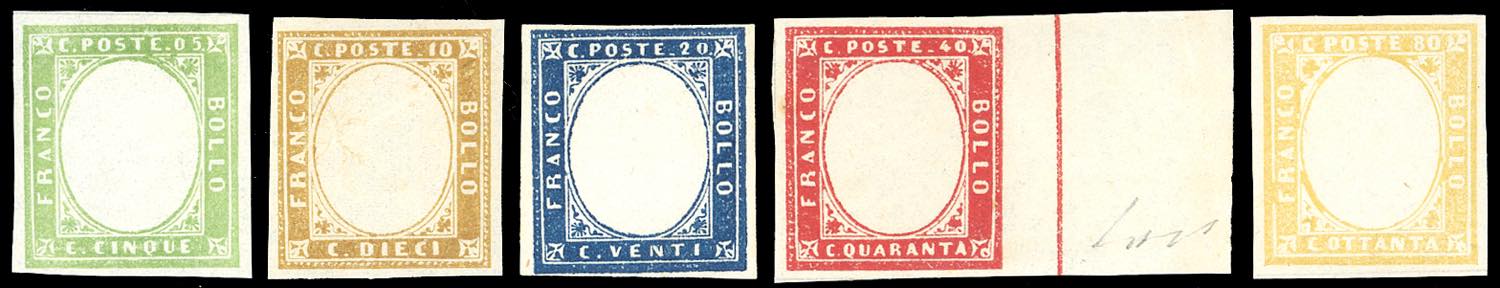1863 - 5 cent., 10 cent., 20 cent., 40 cent. e 80 cent. senza effigie, francobolli naturali (cat.Bolaffi 10B/14B), il 10 cent. con lieve plì d'accordeon, il 40 cent. bordo di foglio con linea di riquadro, gomma originale integra, perfetti e molto freschi. Rari. A.Bolaffi per il 40 cent., Colla per la serie.