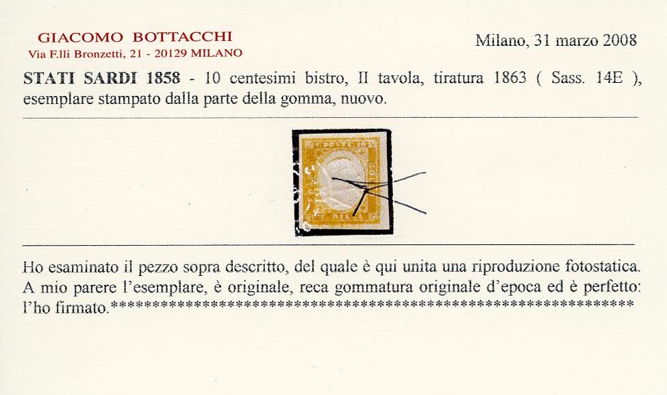1863 - 10 cent. bistro, varietà gommato al recto (14E), nuovo, gomma originale integra, perfetto. Molto raro. Cert. Bottacchi.