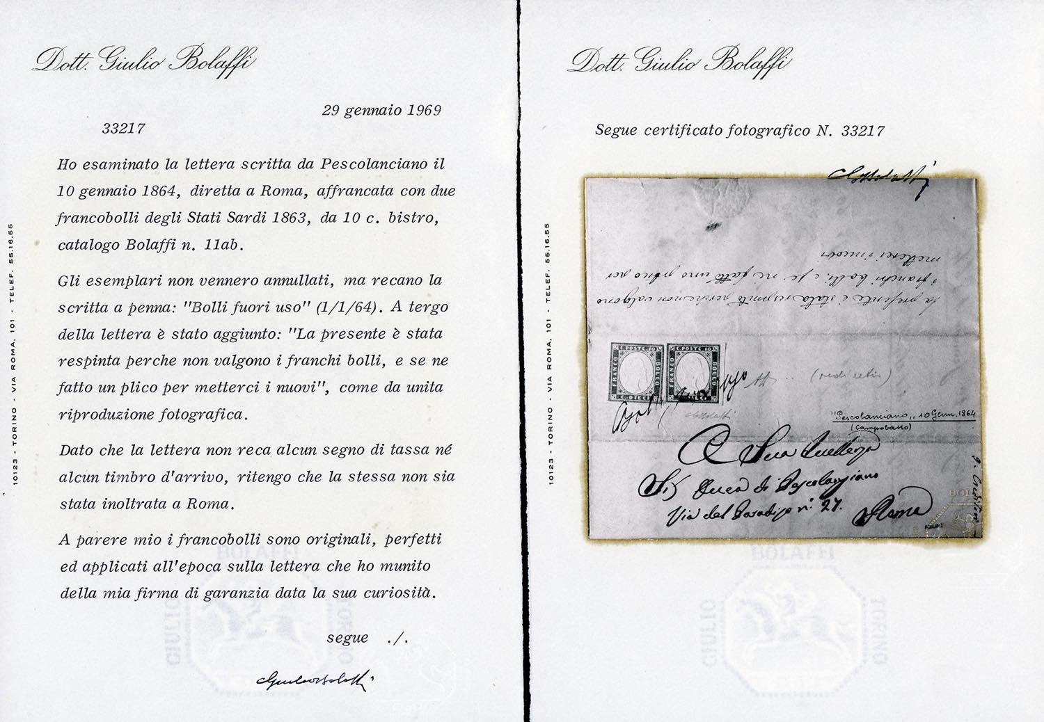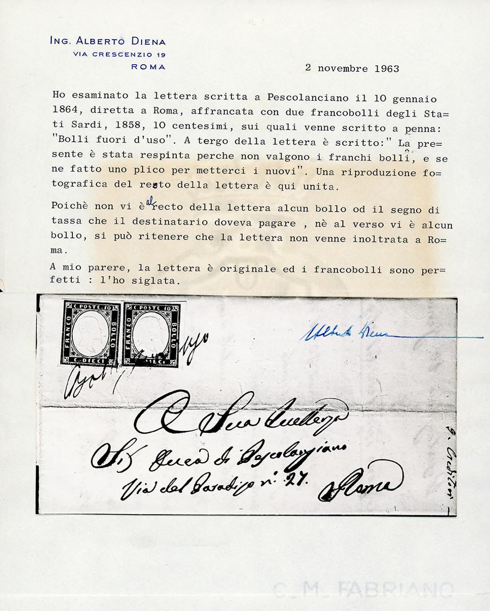 1864 - 10 cent. bistro, due esemplari (14E), perfetti, su lettera scritta Pescolanciano il 10 gennaio 1864, diretta a Roma. I francobolli, fuori validità dal 31 dicembre 1863, vennero ritenuti non validi ed annullati a penna "Bolli fuori uso", aggiungendo al verso la dicitura manoscritta "La presente è stata respinta perché non valgono i franchi bolli, e se ne fatto un plico per metterci i nuovi". La missiva che reca diciture manoscritte tipiche di chi l'ha ricevuta, probabilmente fu inserita in un ulteriore involucro riaffrancato per l'invio a destinazione. Insieme molto curioso e del tutto raro. Dettagliati certificati Allberto Diena e Giulio Bolaffi.
