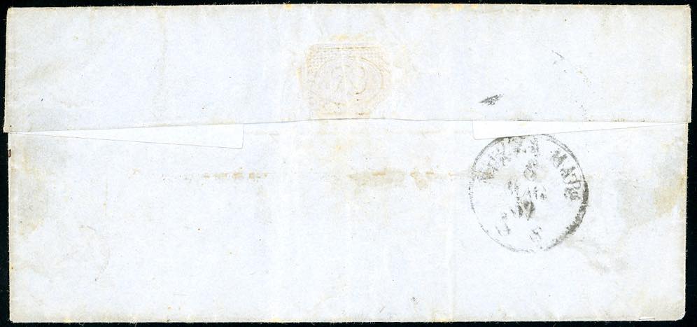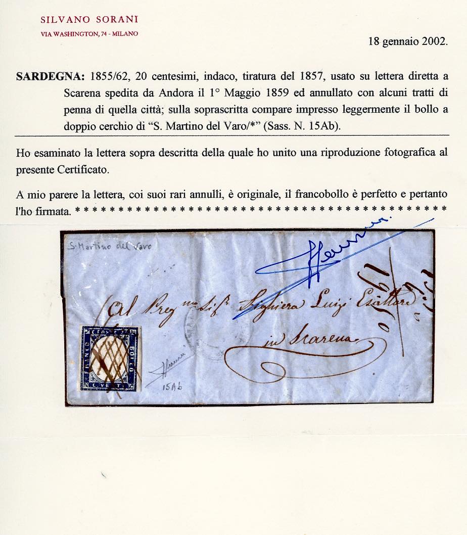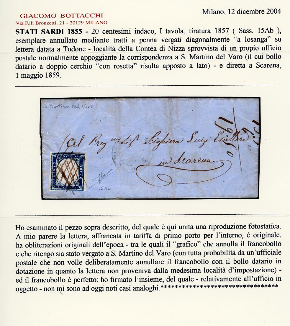 LIGURIA-S. MARTINO DEL VARO, tratti a penna incrociati sull'affrancatura e d.c. a lato, inedito, da quotarsi punti R2/R3 - 20 cent. indaco (15Ab), perfetto, su lettera scritta a Todone (sprovvisto di ufficio postale) 1/5/1859 diretta a Scarena, bollo d'arrivo. Molto rara! Cert. Sorani e Bottacchi.