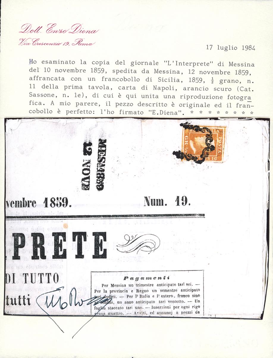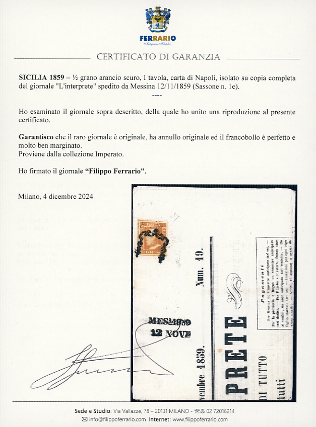 1859 - 1/2 grano arancio scuro, I tavola, carta di Napoli (1e), perfetto e ben marginato, isolato su copia completa del giornale "L'interprete" spedita da Messina 12/11/1859. Estremamente raro e bellissimo. Emilio Diena, cert. Enzo Diena e Ferrario. Ex coll. Imperato.