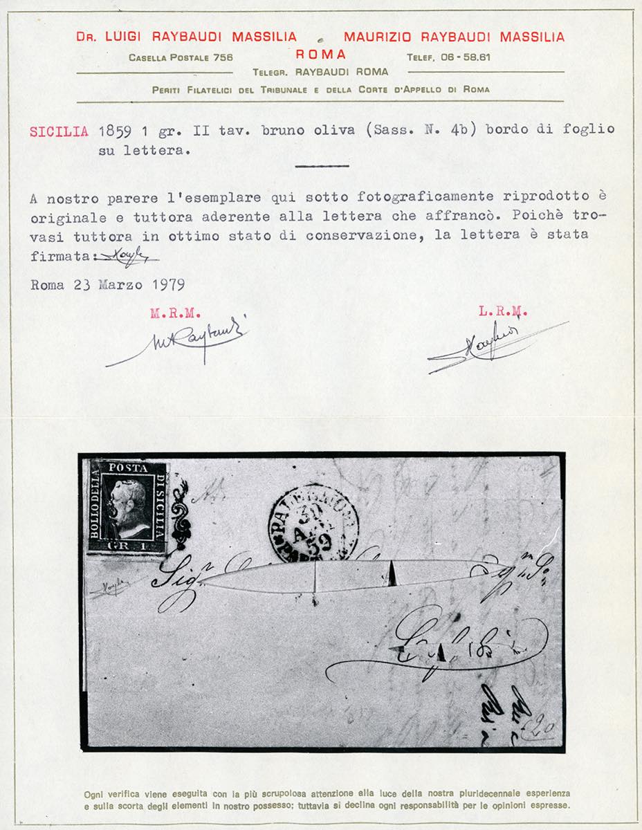 1859 - 1 grano bruno oliva, II tavola (4b), bordo di foglio in basso, perfetto, isolato su lettera di mezzo foglio da Palermo 30/4/1859 per Cefalù, indirizzo parzialmente ritagliato. Uso isolato e tariffa molto rara. A.Diena, Ferrario. Cert. Raybaudi.