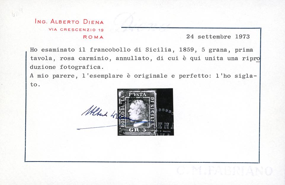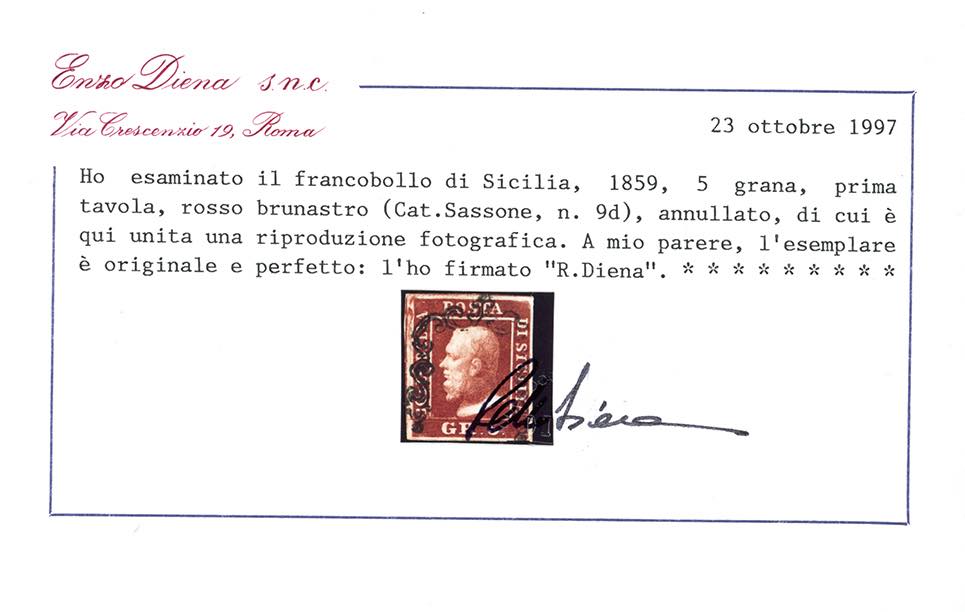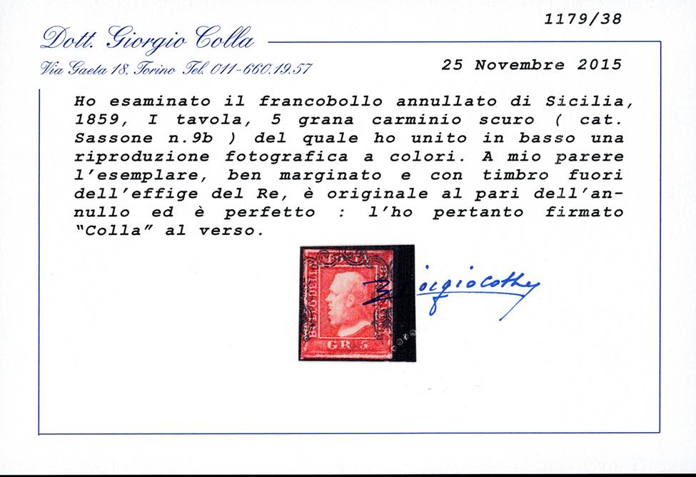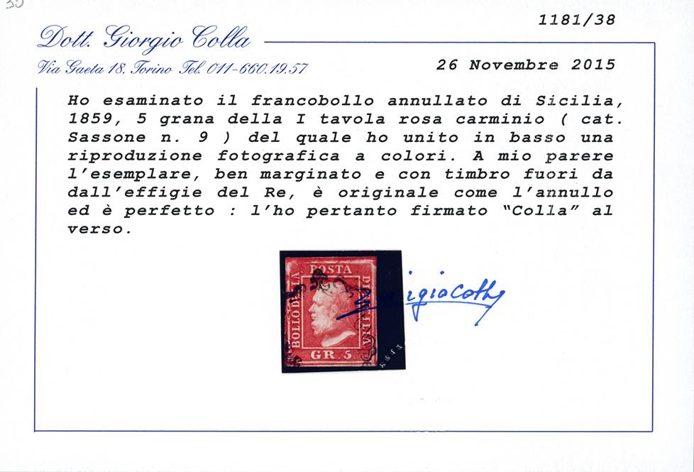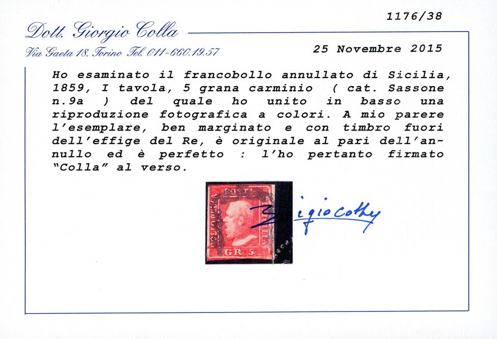 1859 - 5 grana, I tavola, cinque esemplari di differenti tonalità di colore (9,9a,9b,9c,9d), usati, perfetti e di qualità selezionata. Tutti firmati e classificati da noti periti, due cert. Diena e quattro Colla.