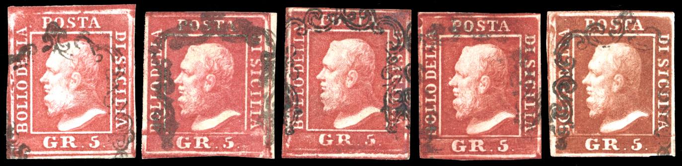 1859 - 5 grana, I tavola, cinque esemplari di differenti tonalità di colore (9,9a,9b,9c,9d), usati, perfetti e di qualità selezionata. ... Read more